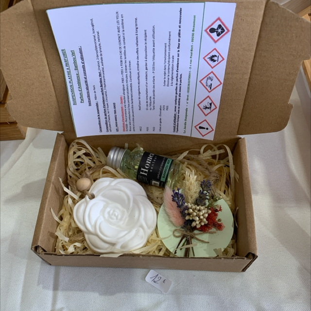 Coffret de deux suspensions à parfumer avec son petit flacon de parfum, d’intérieur, bois de cèdre ou bambou.