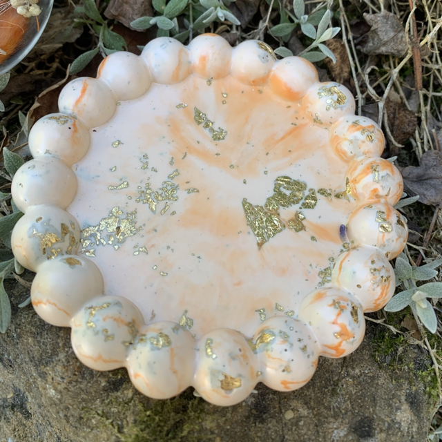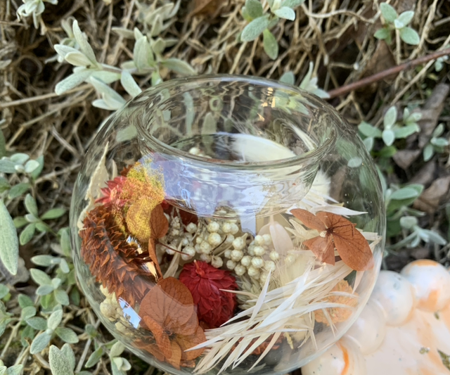 Bougeoir en verre garnie de fleurs séchées et stabilisées dans les tons, crème,orange et rouge. Le socle est en jesmonite marbré, orange et blanc avec quelques feuilles d’or..