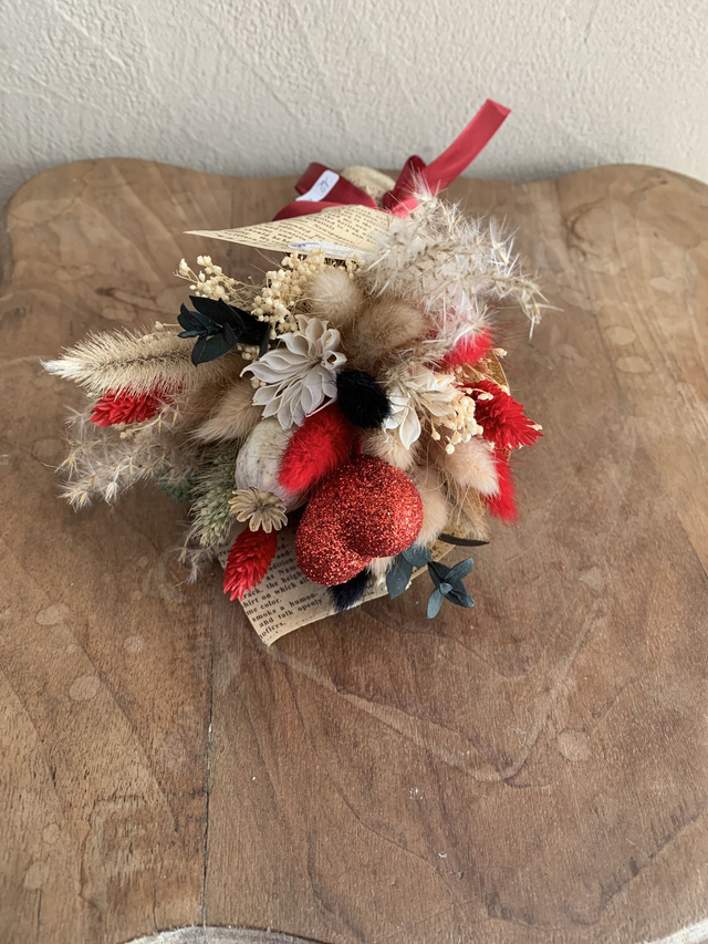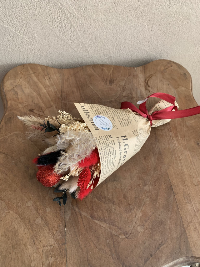 Bouquet de fleurs séchées dans son emballage "journal" dans les tons : rouge, beige, blanc et quelques touches de noir.