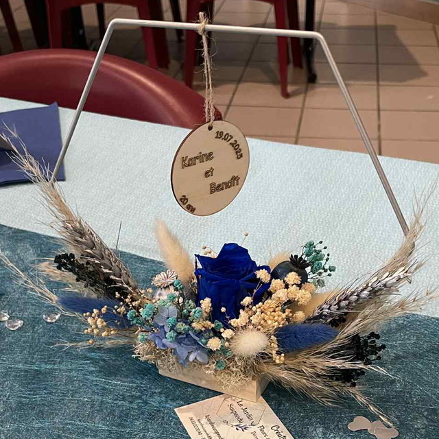 Composition florale de table de forme octogonale sur son support en bois réalisée avec des fleurs séchées et une rose stabilisée. Vous pouvez personnaliser la couleur des fleurs et ajouter si vous le souhaitez, une étiquette en bois gravée avec le nom des mariés ou pour tout autre événement , pour un supplément de deux euros.
