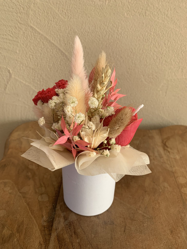 Composition florale comprenant un pot en carton blanc garni de fleurs séchées, d'une bougie et d'un fondant parfumé papillon : Iris et Lavande.