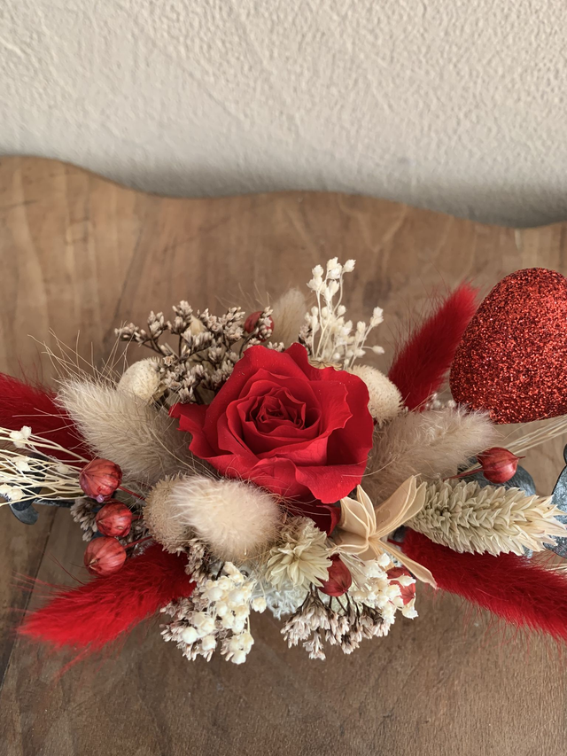 Composition florale à poser composée d'un socle en bois et d'un cercle en métal doré décoré de fleurs séchées et stabilisées dans les tons : vert, beige et rouge et d'une rose éternelle rouge.
