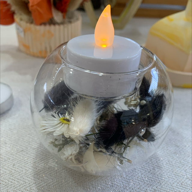 Bougeoir en verre garnie de fleurs séchées et stabilisées, très léger et très raffiné. Il pourra décorer vos tables de manière très originale. Sur commande, la couleur des fleurs peut être modifiée.
