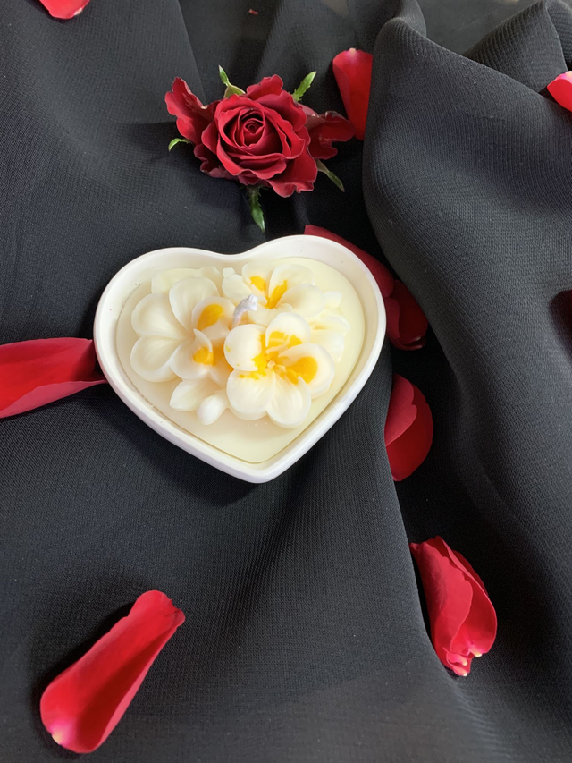 Petit coeur en poudre de sulfate de calcium (sorte de plâtre résistant) garni de cire de soja naturelle parfumée au Monoï.