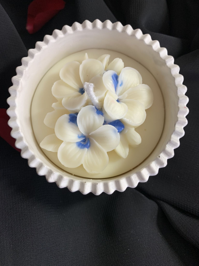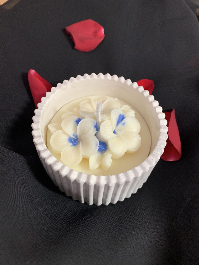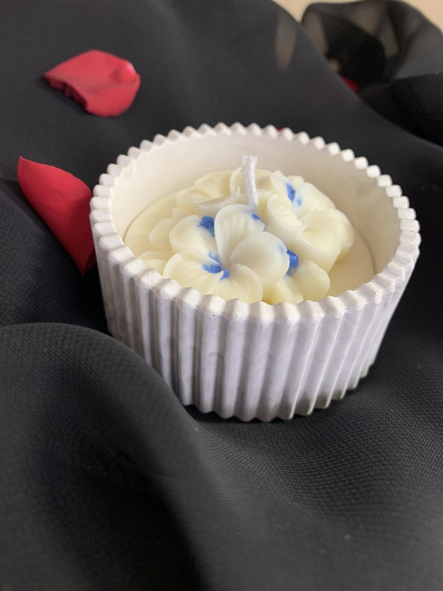 Petit récipient en poudre de sulfate de calcium (sorte de plâtre résistant) garni de cire de soja naturelle parfumée au Monoï.