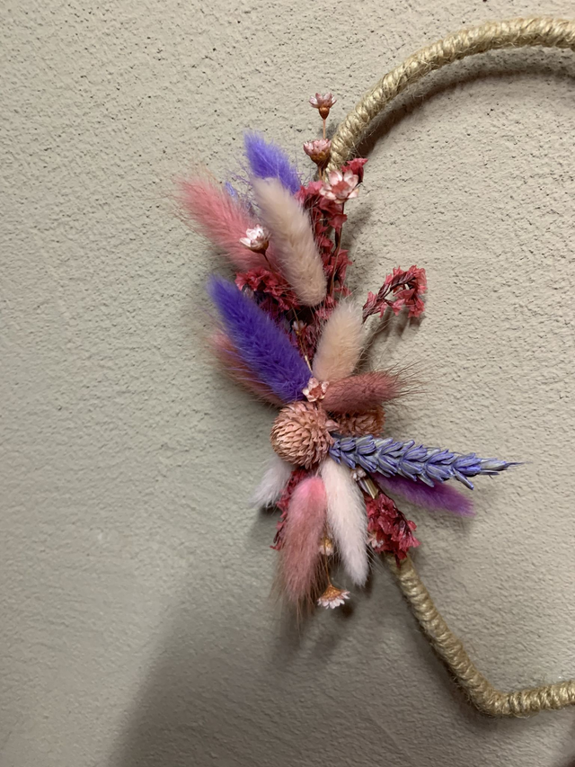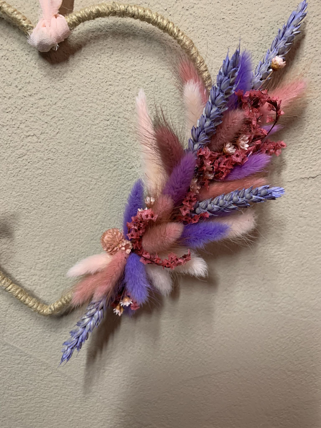 Coeur en métal recouvert de ficelle et de fleurs séchées dans les tons mauve, rose et violet.