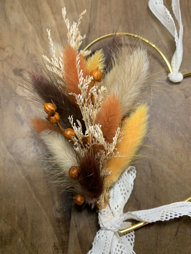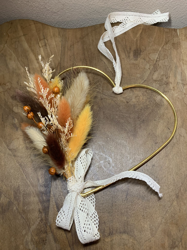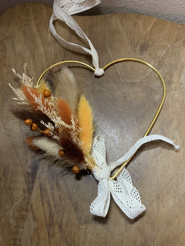 Petit coeur en métal doré recouvert de fleurs séchées dans les tons : marron, orange, beige et jaune.